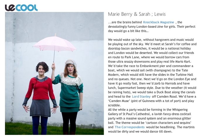 KnockBack (KB) was started because there weren’t any magazines talking to us. Sure we wear high heels and mascara, but we also have ideas and think being mean about someone because they look bad is worse than looking bad. We value good manners and good times and we were bored of being patronised by women’s media. We also wanted to show that ‘light hearted’ doesn’t have to mean ‘idiotic’ we can do low-brow and intelligent and good looking. We can, and we did.
